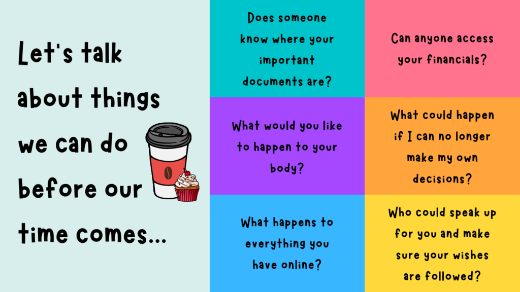 Perhaps over a cuppa, we could take the time to think about, or chat to someone about these key topics, so your needs and wants are expressed and protected: